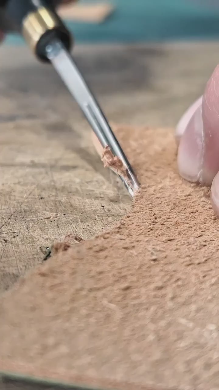 This edge beveling tool is designed to trim and round the edges of leather, giving projects a smooth and professional finish. With a polished sandalwood handle and stainless steel blade, it’s comfortable to use and built for long-lasting performance.
